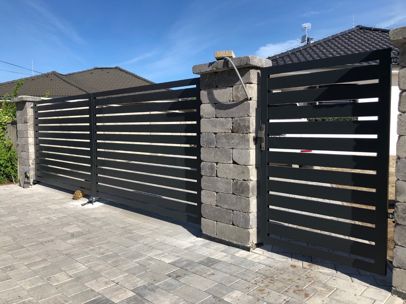 Moderná hliníková brána s horizontálnymi plotovými doskami bola realizovaná v obci Imel. Otvor na bránu bol 420 cm a na bráničku 110cm. V rámci zákazky boli vyrobené aj plotové vložky. Na bráne je namontovaný pohon zn. NICE wingo 2024 spolu s gsm ovládaním cez mobilný telefón. V poslednej dobe je predmetný vzor velmi obľúbeným medzi zákazníkmi. Všetky komponenty sú práškovo lakované a v peci vypaľované. Uvedený vzor je vyhotovený vo verzii kovový pozinkovaný rám a hliníkové plotové dosky 100x20x2mm. V tejto kombinácii vieme vyrobit silný, pevný rám, ktorý dáme žiarovo pozinkovať, čiže nehrdzavie a naň namontujeme hliníkové dosky. To znamená, že v podstate zákazník má cca 90 percent brány z hliníku. Bránička je otváraná elektrickým zámkom, čiže zvonka je moderná pevná kľučka (štvorec). Pánky sme realizovali klasické, nastaviteľné, čo znamená že brány sa dajú po celú dobu nastaviť podľa podľa potreby (zima, leto).