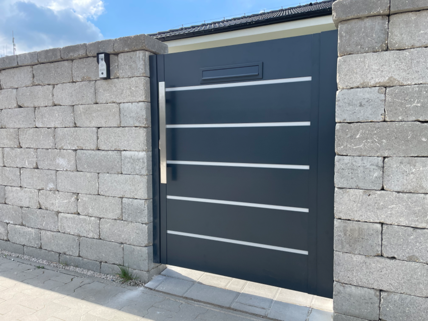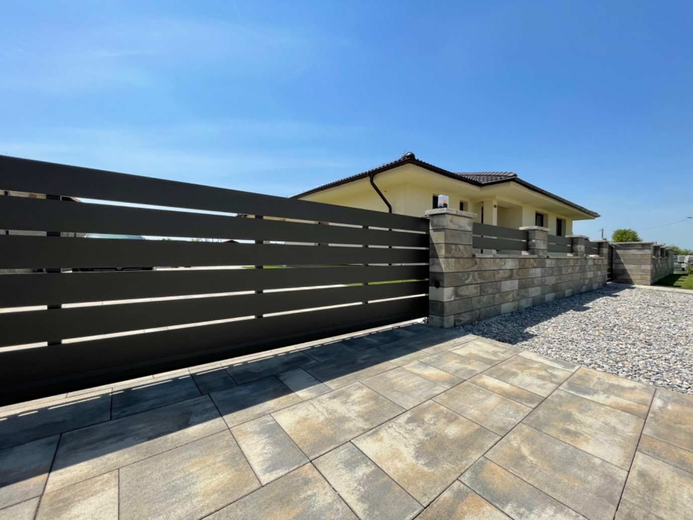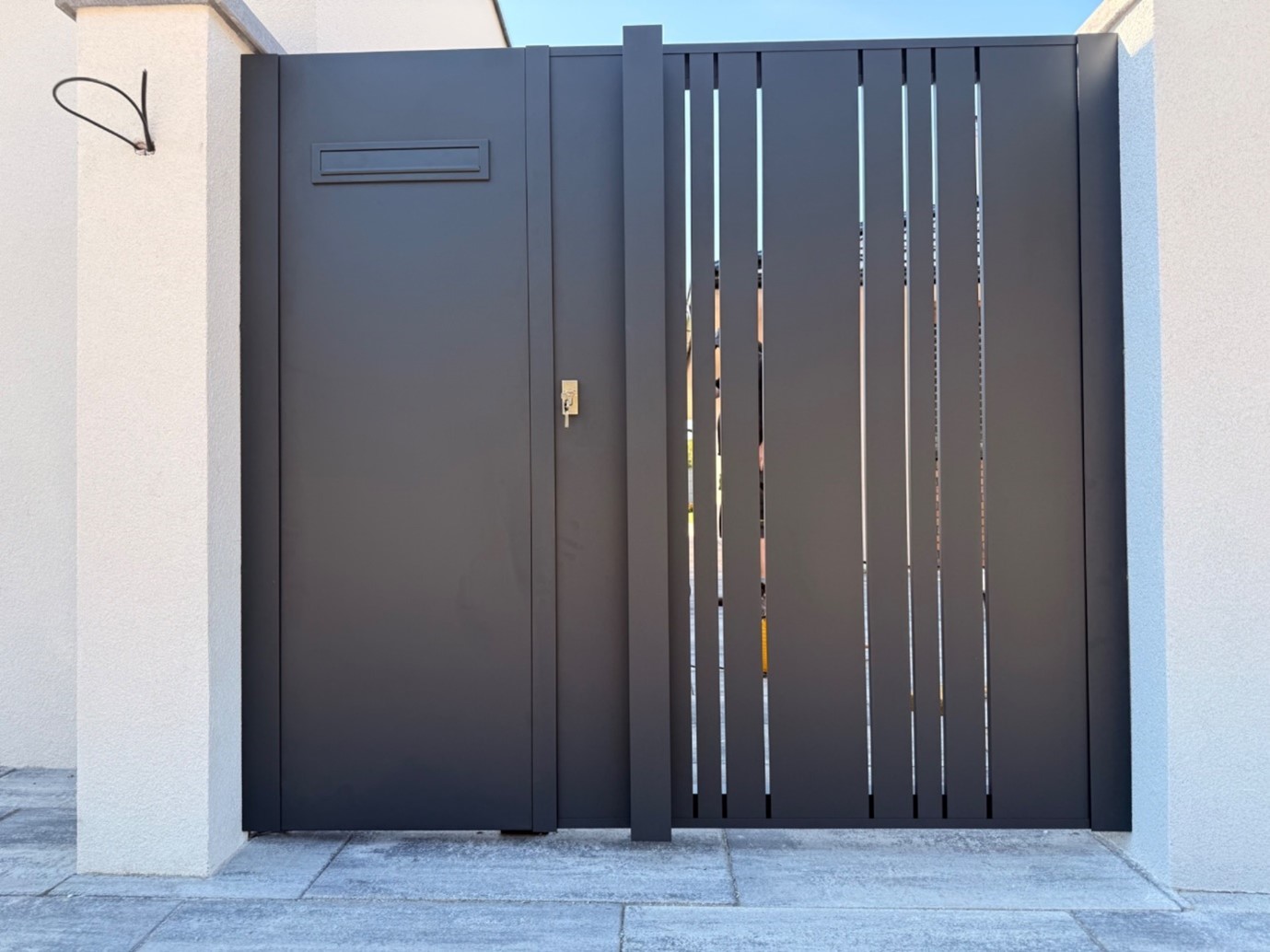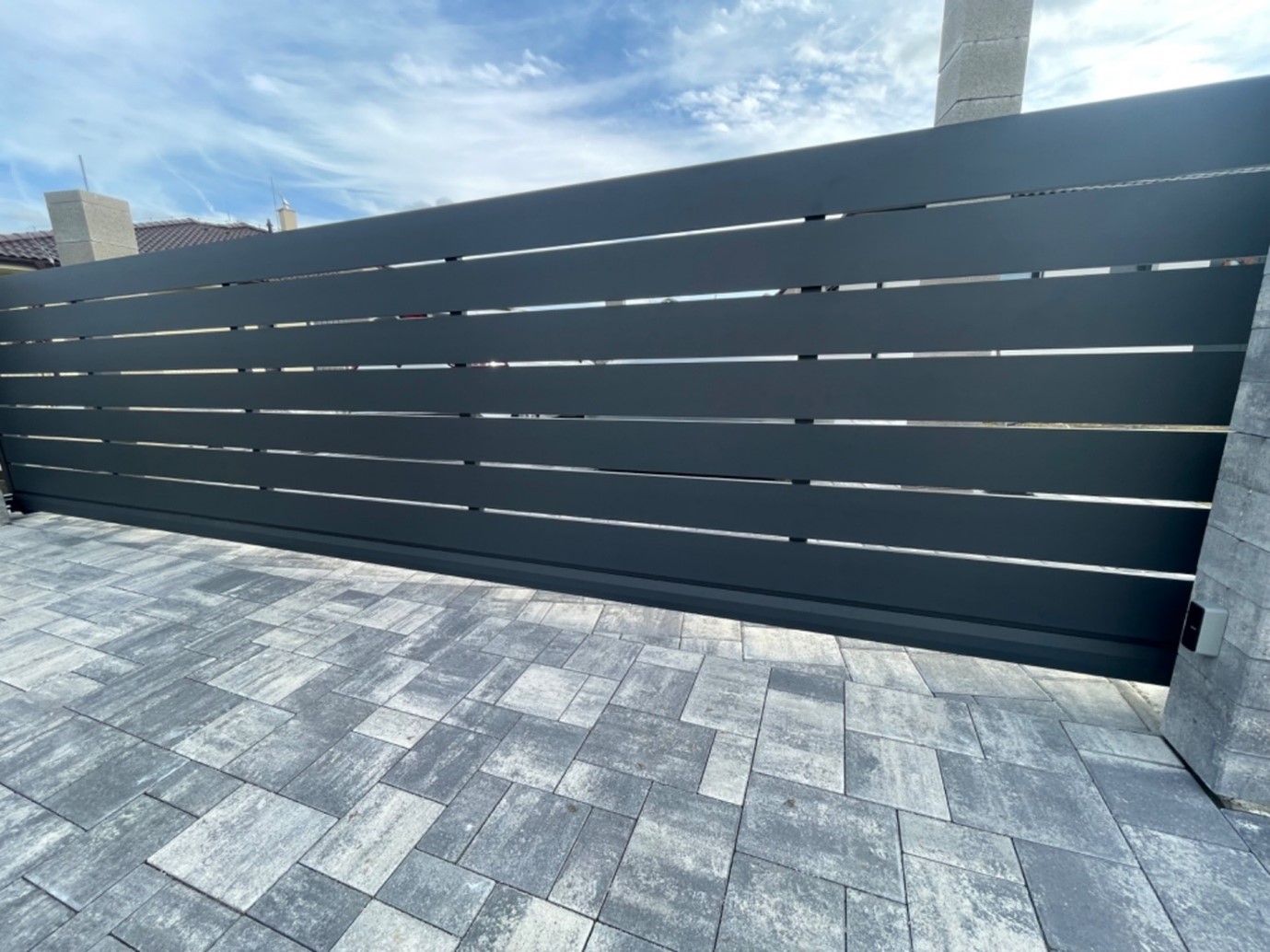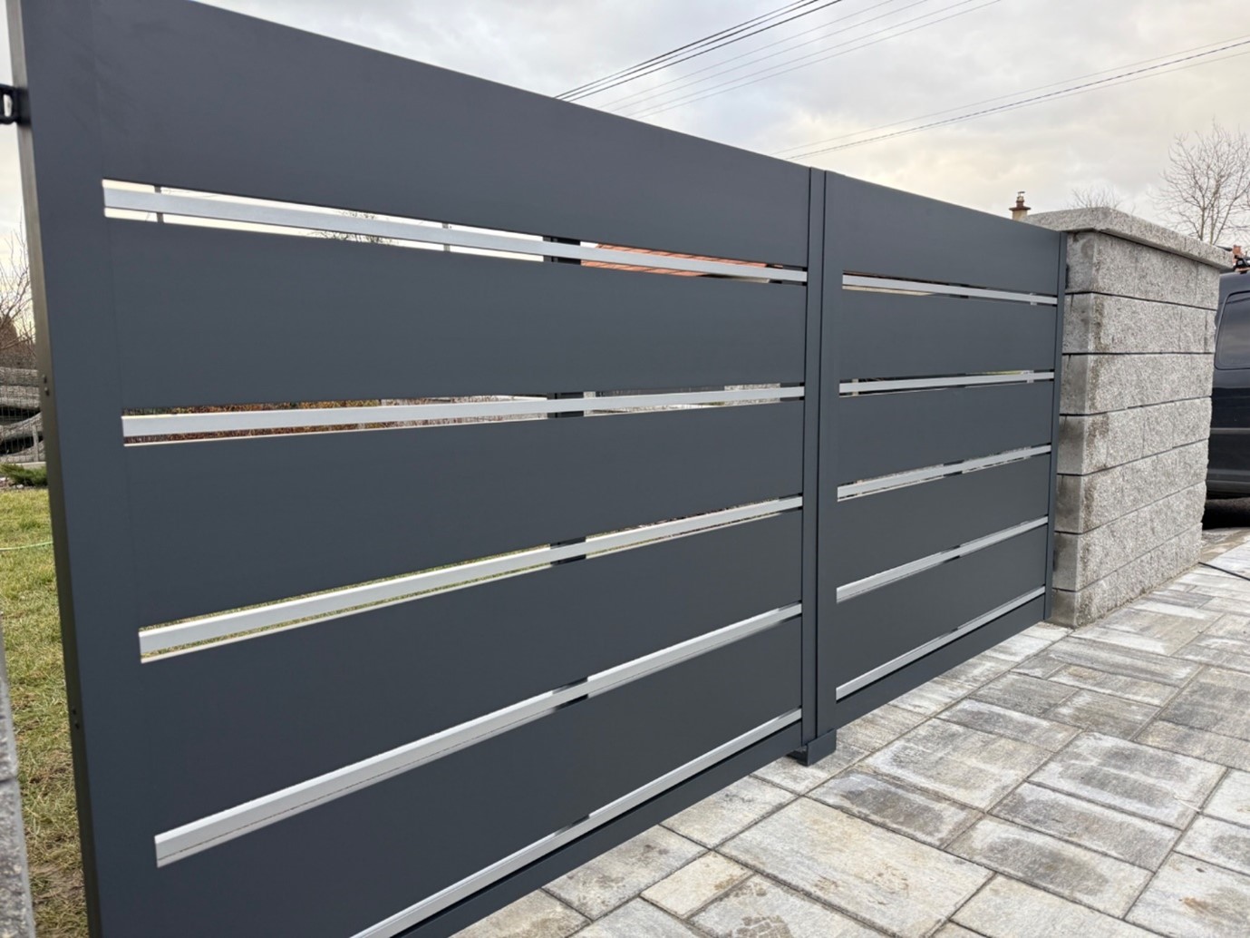 Dnes sme úspešne dovzdali modernú automatickú hliníkovú posuvnú bránu s integrovanou personálnou bráničkou. Súčasťou objednávky bola kompletná dodávka posuvnej hliníkovej brány, spoľahlivého pohonu a samostatnej hliníkovej bráničky s elegantnou nerezovou kľučkou. Celý systém je navrhnutý tak, aby spojil vysokú odolnosť, dlhú životnosť a reprezentatívny vzhľad vášho pozemku. Posuvná brána aj bránička sú vyrobené z robustného rámu 60 × 60 mm, ktorý zaručuje stabilitu a pevnosť aj pri intenzívnom používaní. Výplň tvoria hliníkové plotové dosky so šírkou 200 mm a 20 mm. Širšie dosky sú v odtieni RAL 7016 (antracitová sivá) a užšie v odtieni RAL 9006 (svetlá hliníková), pričom medzi jednotlivými lamelami je 1 cm medzera. Tento kontrast vytvára moderný, čistý a nadčasový dizajn, ktorý sa hodí k súčasnej architektúre rodinných domov aj firemných objektov. Rozmery posuvnej brány sú 500 × 140 cm, čo poskytuje komfortný prejazd pre osobné aj väčšie vozidlá. Personálna hliníková bránička s rozmermi 100 × 140 cm zabezpečuje pohodlný peší vstup. Bránička sa otvára manuálne smerom dovnútra pozemku, čím šetrí priestor na chodníku a zvyšuje bezpečnosť pri otváraní. Nerezová kľučka dopĺňa celkový vzhľad a zároveň odoláva poveternostným vplyvom. Automatický pohon posuvnej brány je dimenzovaný na pravidelné používanie a umožňuje komfortné ovládanie bez nutnosti vystupovať z vozidla. V kombinácii s kvalitnou hliníkovou konštrukciou tak získavate riešenie, ktoré si vyžaduje minimálnu údržbu, nehrdzavie a dlhodobo si zachováva svoj vzhľad. Ak hľadáte spoľahlivú a estetickú bránu, podobná realizácia môže byť ideálnou inšpiráciou pre váš projekt.