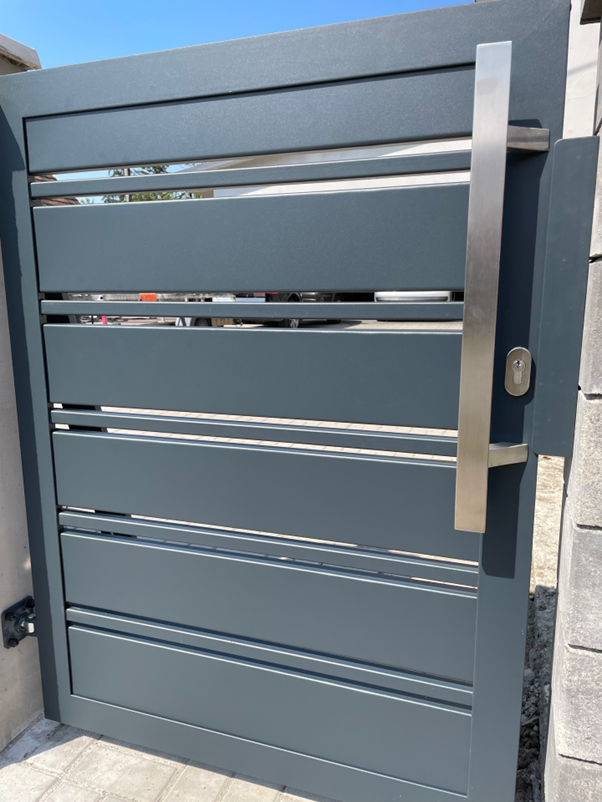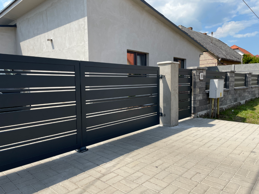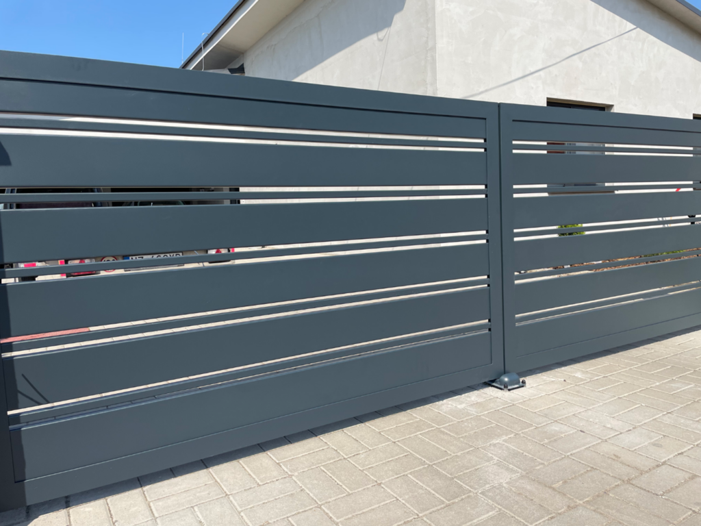 Jednalo sa o veľmi obľúbený moderný vzor či už pozinkovaných alebo hliníkových brán. Konkrétne táto zákazka bola žiarovo pozinkovaná a práškovo nalakovaná. Odtien brán bol zvolený antracitový RAL 7016 v jemnej štruktúre. Jemná štruktúra sa vyznačuje jemným reliéfom, drobnými trblietkami a vysokým prekrývaním nedokonalostí, hlavne po pozinkovaní, kde na rámoch zostávajú nepekné kvaple. Tieto kvaple sa síce po pozinkovaní vybrusujú, ale dokonale, ako čistá hliníková plocha to nebude.