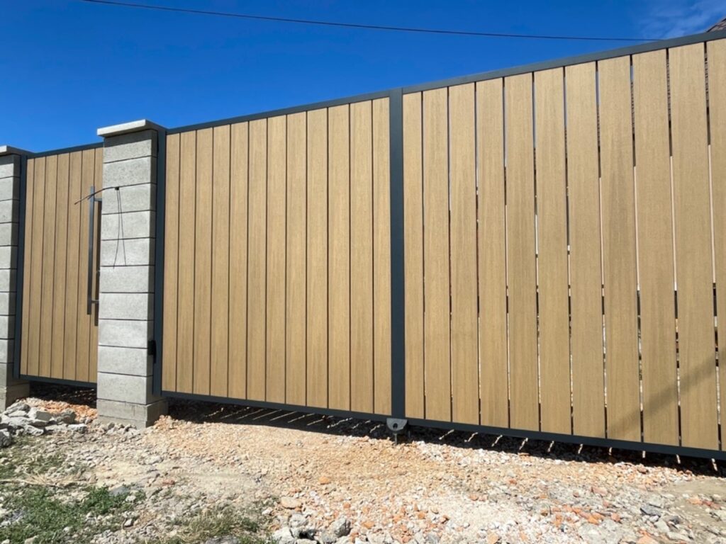 Hliníkovú dvojkrídlovú bránu s bráničkou s výplňou drevoplast sme realizovali v Šuranoch okres Nové Zámky.