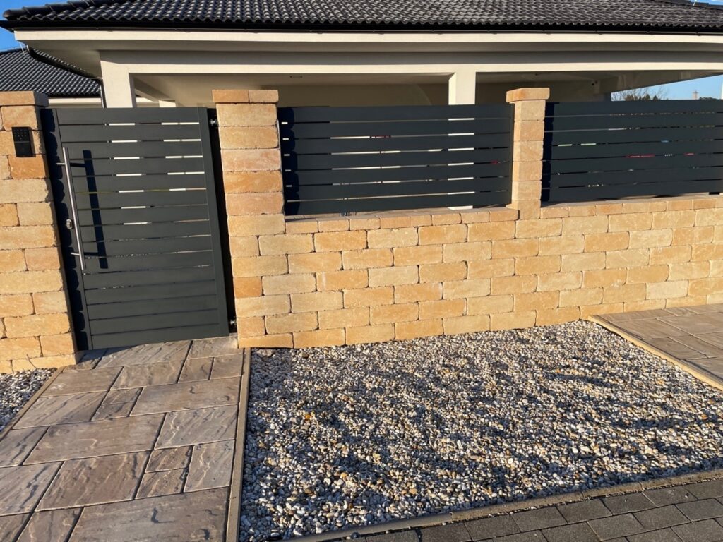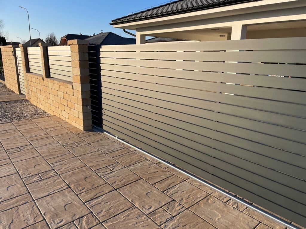 Hliníková posuvná brána s hliníkovou bráničkou a hliníkovými plotovými vložkami vo Vrábľoch, okes Nitra