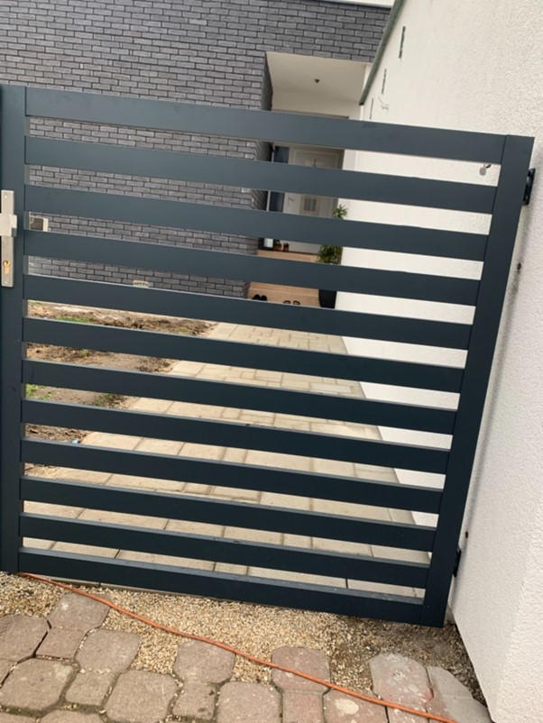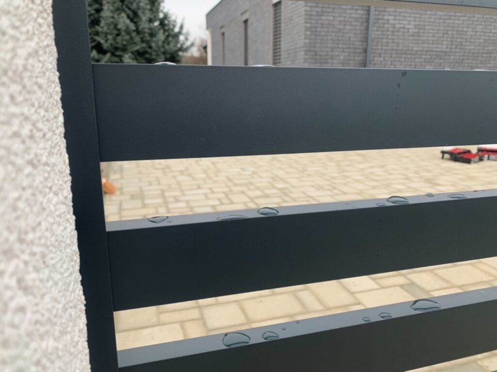 Celá zakázka je ako obyčajne pozinkovaná v žiarovej zinkovni a následne práskovo zalakovaná a v peci vypálená. Zákazníkom bol v tomto prípade zvolený veľmi obľúbený antracitový odtieň RAL 7016 vo vysokom matnom odtieni v jemnej štruktúre. Na bráničke bol zachovaný pôvodný stĺp na dorazovej strane, čo trochu komplikovalo osadenie bráničky.