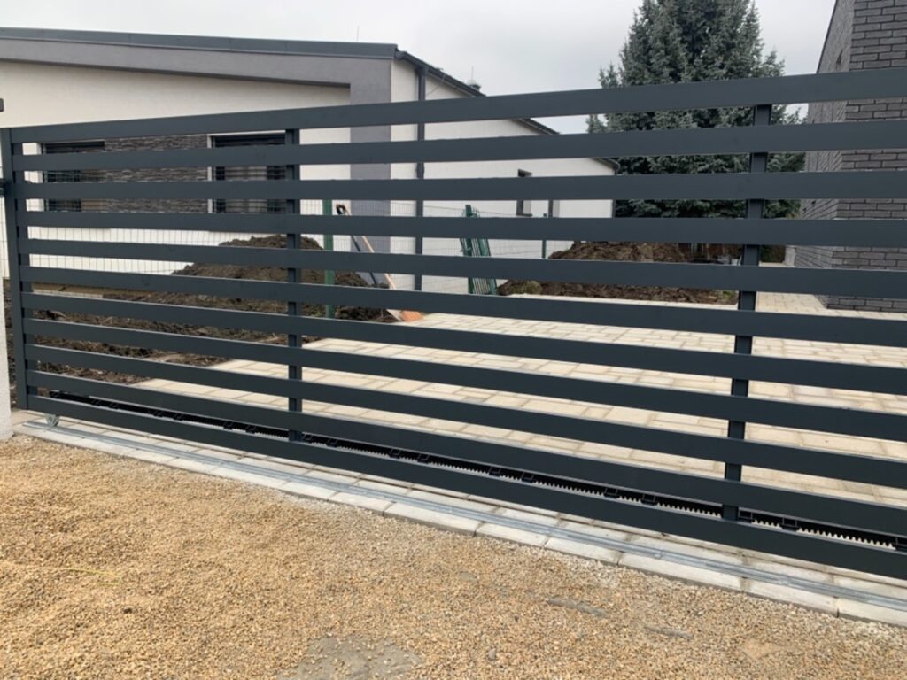Moderná hliníková posuvná brána bola v tomto prípade realizovaná v obci Úľany nad Žitavou. Riešená bola priečnymi hliníkovými doskami 60x20x2mm. Medezera medzi doskami je zachovaná na želanie zákazníka viac ako bežne, tj. cca 40 mm. Posuvná brána je osadená na V koľajnici so 60 mm kolieskami, čo vytvára medzeru pod bránou cca 70 mm.
