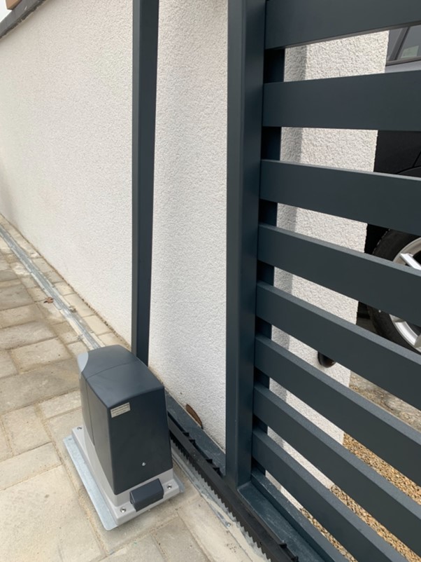 Plotové dosky sú na uvedenej bráne 2x spevnené, avšak domysleným riešením skrytých sróbov, nie je vidno ani jeden s 200 kusov. Ako pohon sme nainštalovali overený NICE ROAD 400 spolu s fotobunkami. K uvedenej posuvnej bráne prislúcha aj vstupná bránička spolu s nerezovým hranatým nie obyčaným madlom.