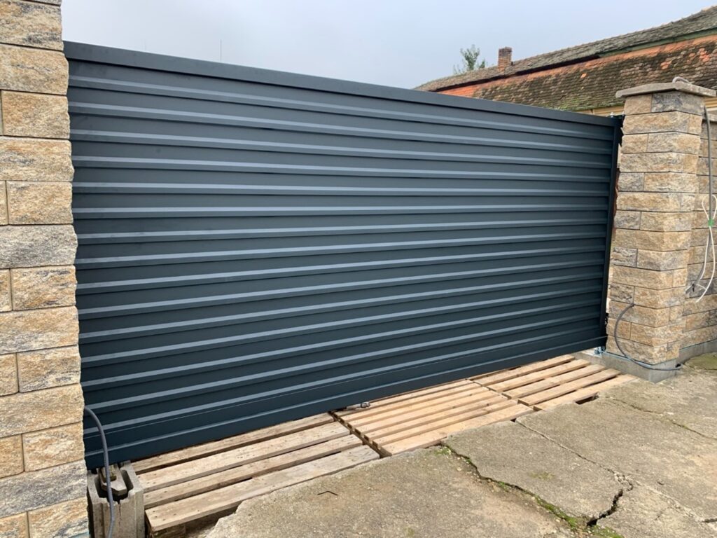 Moderná lamelová samonosná brána s bráničkou v obci Dvory nad Žitavou, okr. Nové Zámky