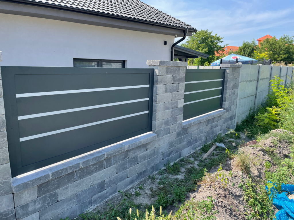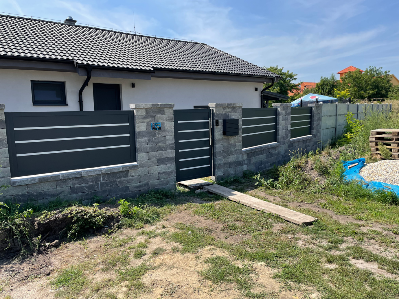V takom rozobratom stave sme celú zákazku odviezli do práškovej lakovne, kde sa opatrila špeciálnym antracitovým odtieňom RAL 7016 v jemnej štruktúre, ktorá je menej náchylná voči prípadným nedokonalostiam po pozinkovaní. Práškové lakovanie je odolné voči blednutiu, tak si brána zachová stály odtieň. Brána je široká 400 cm a vysoká 160 cm. Je osadená na samonosnom C profile 80x80x5 mm dlhom 600 cm. Je poháňaná pohonom NICE Road 400. Bránička je rovnako vysoká 160 cm a široká 100 cm.