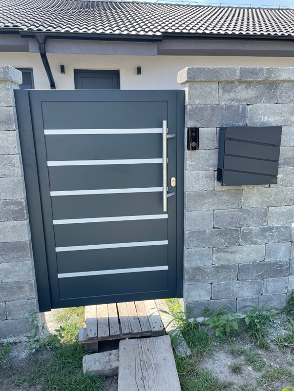 Na bráničke je osadené skosené nerezové madlo dĺžky 60 cm. Zákazka obsahuje aj 4 ks. plotových vložiek ktoré esteticky dopĺňajú celé oplotenie.