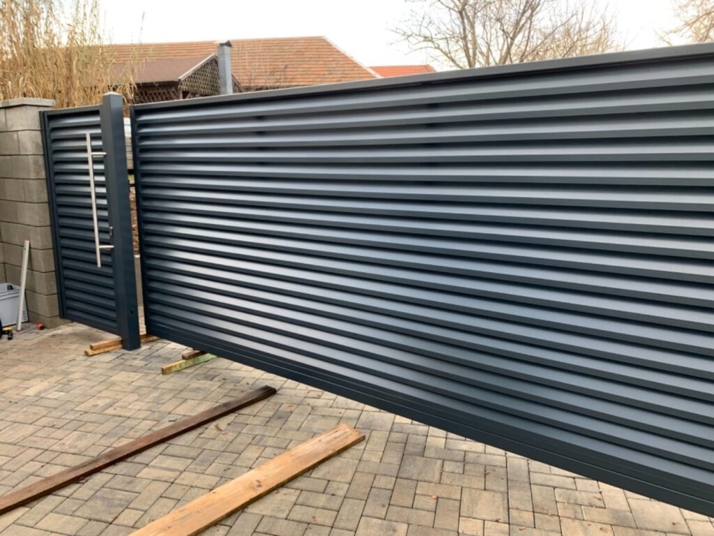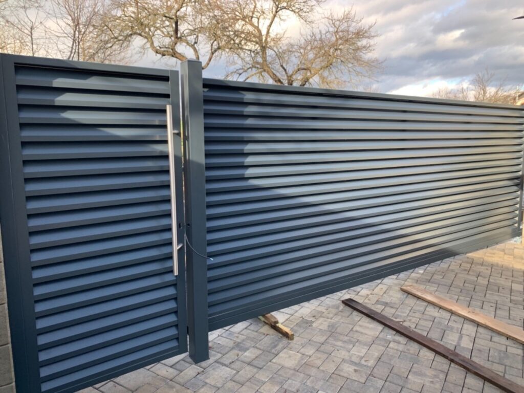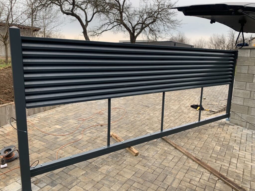 Jedná sa o klasické moderné nami používané hliníkové lamely v pozinkovanom ráme. Predmetné lamely sú štandartne široké 110 mm. Brána má vcelku nadštandartný rozmer, spolu s prevysom je to 700 cm. Svetlosť medzi stĺpikmi je 500 cm. Je osadená na samonosnom systéme 70/70/4 mm. Bránička je široká 100 cm. Na jej pravej strane je osadené nerezové skosené moderné madlo. Taktiež je namontovaný aj elektrozámok. Výška brán je 180 cm.